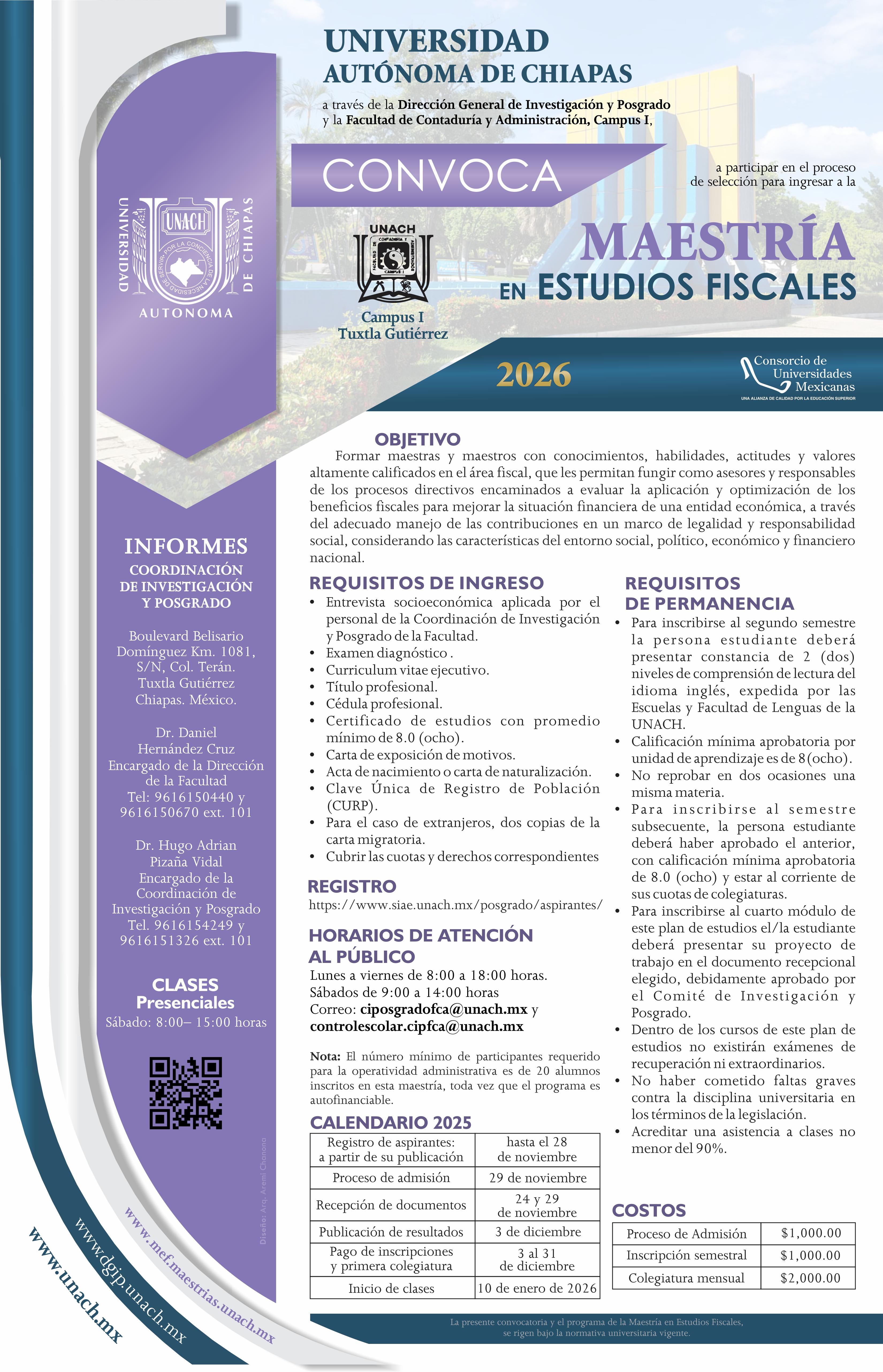 La persona egresada de la Maestría en Estudios Fiscales contará con las competencias técnicas, genéricas y sociales propias del área fiscal en el ámbito nacional y local que le permitirá desempeñarse eficientemente en materia de análisis e interpretación de las disposiciones fiscales; así como, la interpretación y aplicación de estrategias jurídico-fiscales que permitan en la conjunción Estado-Contribuyente el rediseño de un sistema tributario justo y adecuado a la realidad social con apego estricto a la legalidad y a las normas éticas.