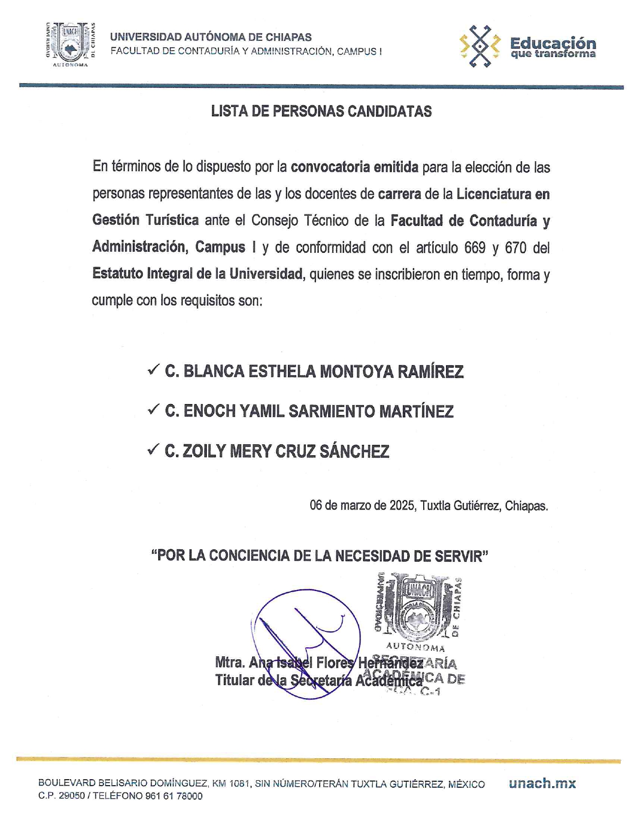 En términos de lo dispuesto por la convocatoria emitida para la elección de las personas representantes de las y los docentes de carrera de la Licenciatura en Gestión Turística ante el Consejo Técnico de la Facultad de Contaduría y Administración, Campus I y de conformidad con el artículo 669 y 670 del Estatuto Integral de la Universidad, quienes se inscribieron en tiempo, forma y cumplen con los requisitos son: