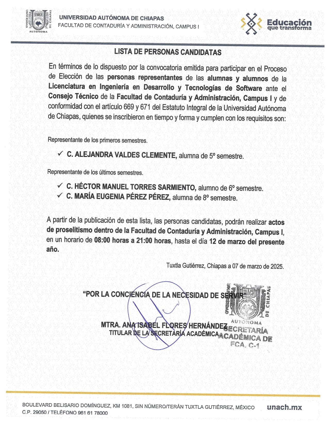En términos de lo dispuesto por la convocatoria emitida para participar en el Proceso de Elección de las personas representantes de las alumnas y alumnos de la Licenciatura en Ingeniería en Desarrollo y Tecnologías de Software ante el Consejo Técnico de la Facultad de Contaduría y Administración, Campus I y de conformidad con el artículo 669 y 671 del Estatuto Integral de la Universidad Autónoma de Chiapas, quienes se inscribieron en tiempo y forma y cumplen con los requisitos son: