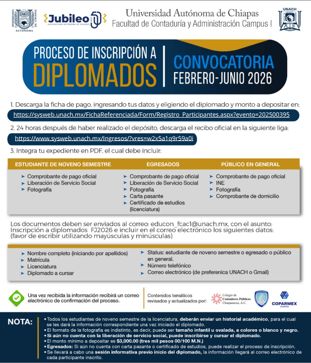 La Facultad de Contaduría y Administración Campus I, a través de la Coordinación de Educación Multimodal y Continua, invita a estudiantes de 9° semestre, egresados y público en general a participar en los Diplomados en modalidad virtual, periodo febrero–junio 2026.